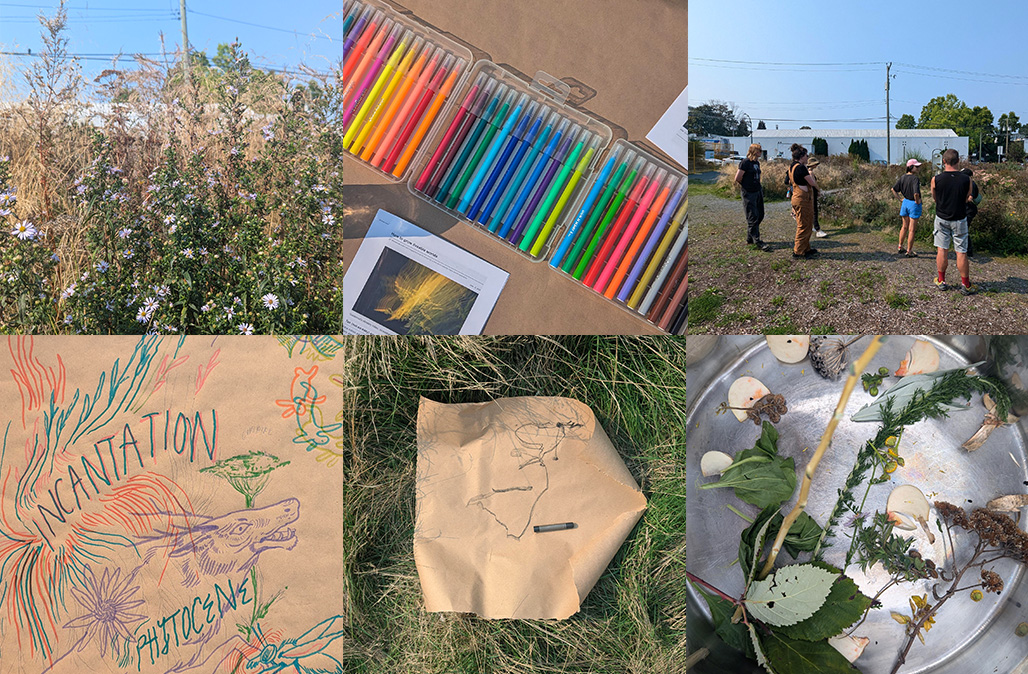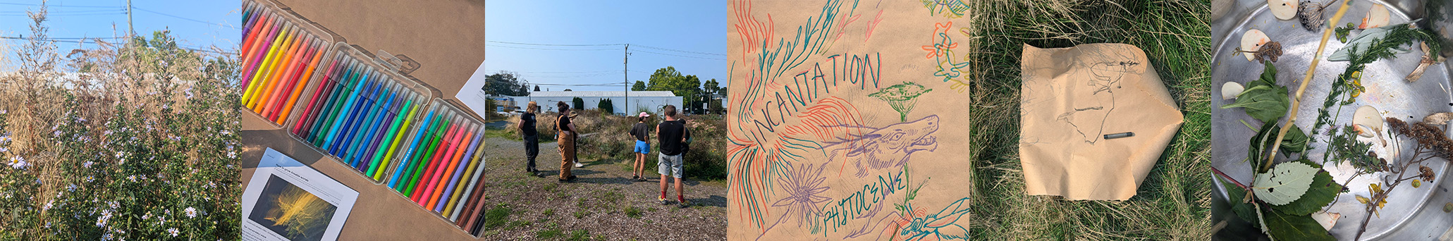 Walking AdjacencyThe urban landscape is teeming with undergrowth, underworlds, underplaces. These are sites of refuge, desire paths, fire pits, guerrilla gardens, and encampments: by-places. Today, Vancouver is undergoing parallel but entwined projects of mass redevelopment that promise a safer, more beautiful, and "affordable" city. Such growth overlooks what lies underneath: ad-hoc zones of impersonal care. What new modes of attunement can we experiment with to feel incipient futures—those silenced by masterplans? We invite you to get lost, feel by-places at work, and walk adjacency together. Guided by figures from our ongoing project, you are invited to make traces (drawings, photos, audio, and fragmentary writings) to grow an an/archive of by-places.